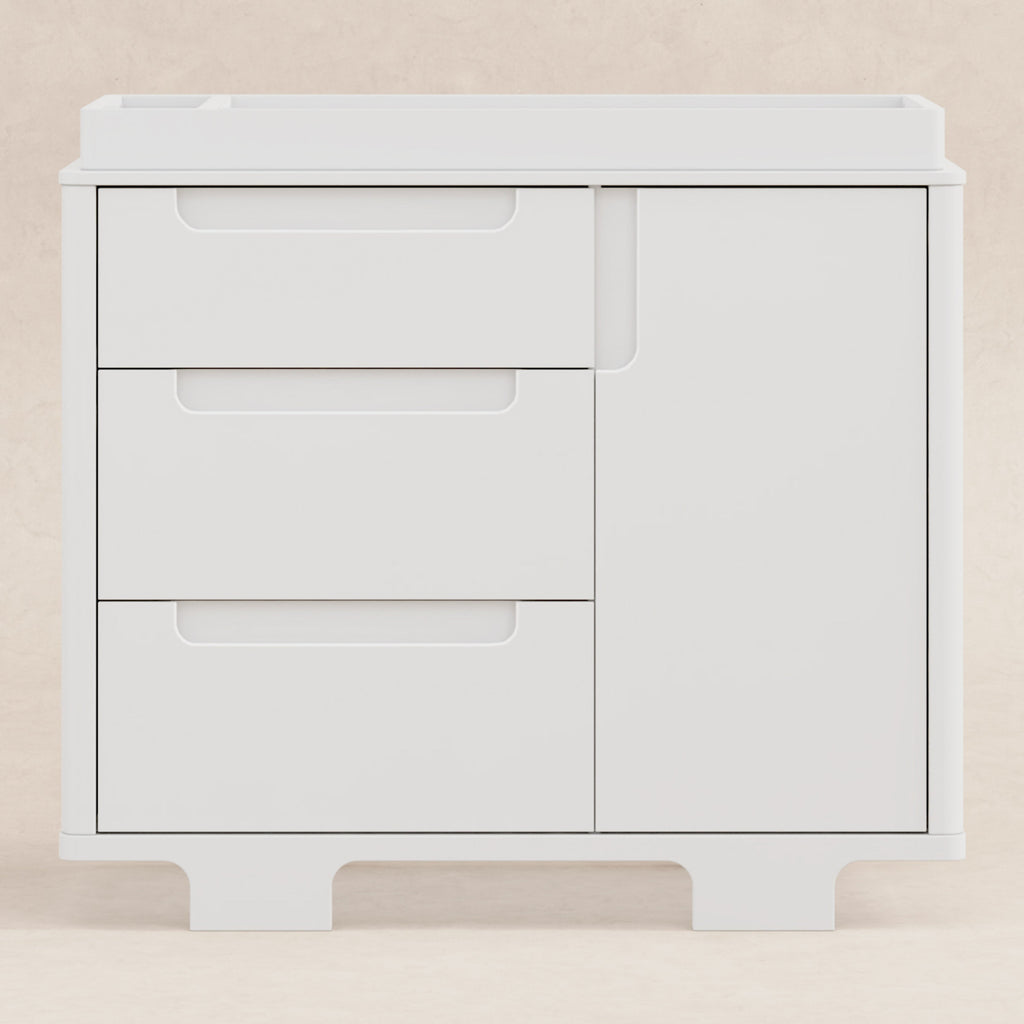 Designed to complement the Yuzu 8-in-1 All-Stages Crib, the Yuzu 3-Drawer Changer Dresser marries form and function with playful arched feet, gently curved corners, included changing tray, and plenty of storage with 3 drawers and 1 spacious cabinet. Whether you're going for a classic, modern, or eclectic look, this versatile dresser is a perfect statement piece in the nursery.