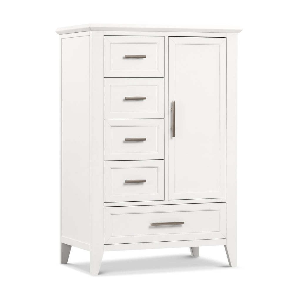 The Beckett Chifforobe bridges the gap between traditional and modern design with its texturized wood finish, clean silhouette and thoughtful detailing. Featuring drawers and cabinet space, simple tapered feet, and mitered cuts with contemporary 45 degree trimming, the Beckett Chifforobe is a transitional piece that will grow with your family.